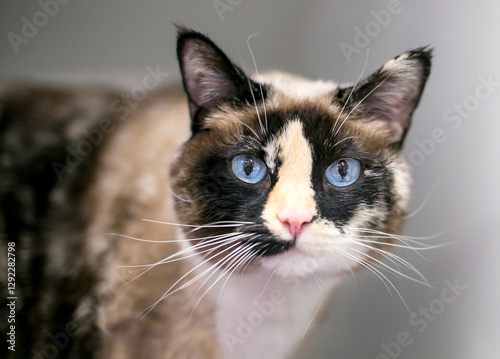 A Calico shorthair cat with blue eyes