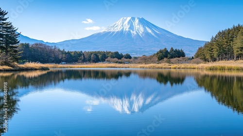 A calm mountain lake reflecting the majestic snow-capped peaks, creating a perfect scene for promoting wellness, adventure, or eco-friendly tourism.