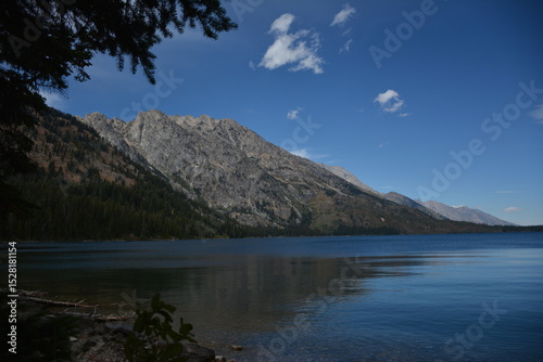 A calm water body stretches ahead, with majestic mountains rising in the background and dense trees lining both sides, creating a picture of pure natural peace.