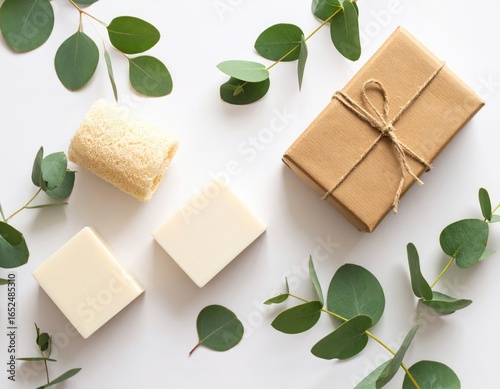 A calming arrangement featuring natural soaps, loofah, eucalyptus, and a wrapped gift.