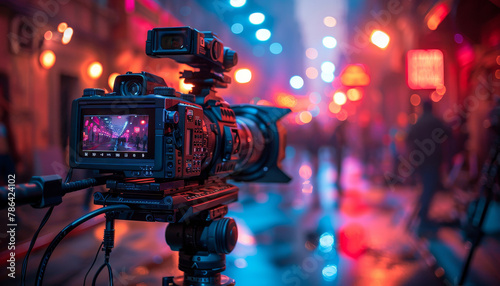A camera is set up in the rain, capturing a busy city street by AI generated image