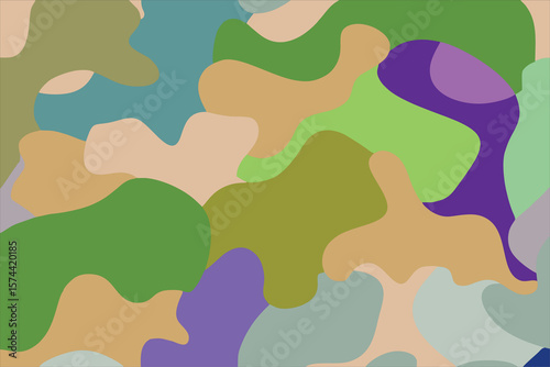 A camouflage pattern with green, tan, and purple hues