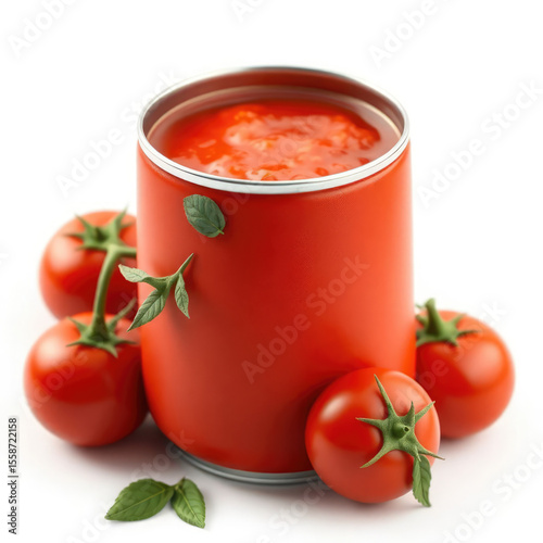 A can of tomato sauce is surrounded by fresh, ripe tomatoes and fragrant basil.