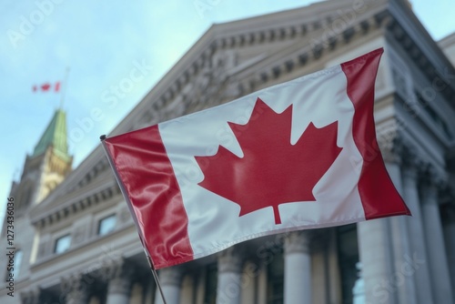 A Canadian flag flying outside a building, possibly a government or civic structure