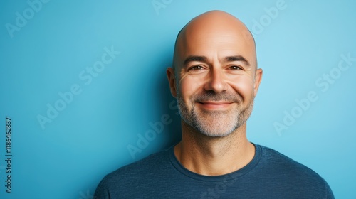A cancer survivor, a man with a bald head, is smiling and looking at the camera against a blue background