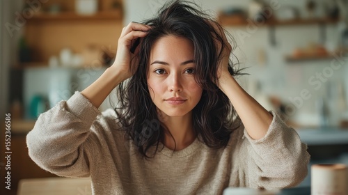 A candid portrait of a woman with messy hair, looking introspective and thoughtful in a cozy home environment, reflecting personal feelings and moments of self-discovery.