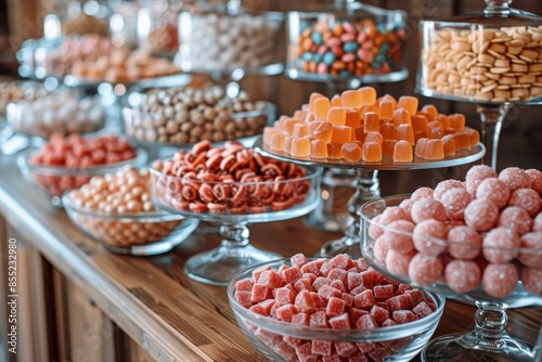A candy buffet at a party, with different types of candies arranged in glass jars and bowls.