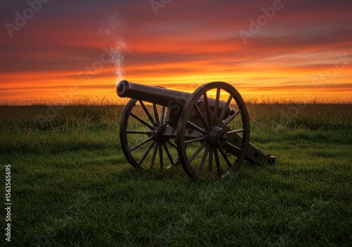 A cannon emits smoke on a grassy field against a vibrant sunset sky