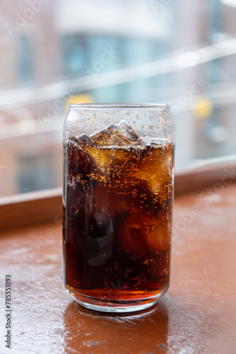 A can-shaped glass of Cola on the table with bokeh background