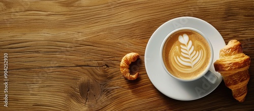 A cappuccino and a croissant placed on a wooden table Flat lay view with a copy space image