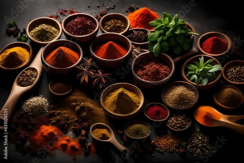A captivating arrangement of aromatic herbs and spices for cooking is beautifully showcased against a dark background