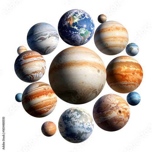 A captivating circular arrangement of diverse planets and celestial bodies, illustrating the vastness and variety of our solar system and beyond, presented with detailed realism.