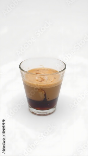 A captivating close up of a finely layered espresso shot in a clear glass elegantly displayed on a crisp white background with dramatic lighting