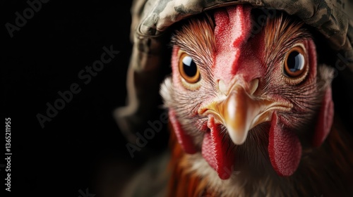 A captivating close-up of a chicken dressed in a military helmet, showcasing its fierce gaze and unique presence, blending humor with a strong character.