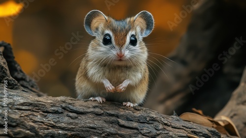 A captivating close-up of a cute deer mouse perched on a weathered branch