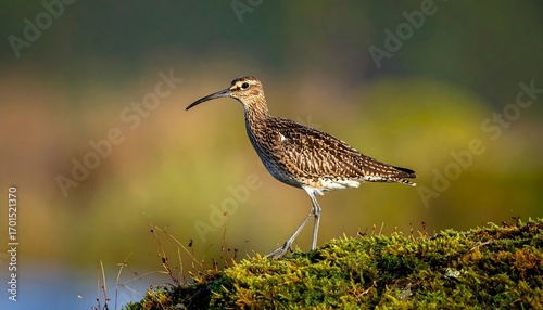 A captivating close-up of a solitary shorebird perched gracefully on a mossy outcrop, showcasing its intricate plumage and elegant posture against a softly blurred natural backdrop.