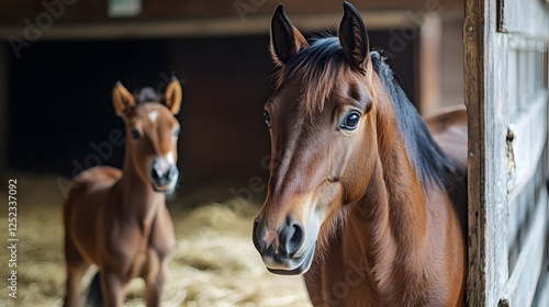 A captivating close-up of two horses in a barn, showcasing their unique features and gentle demeanor. The warm atmosphere evokes a sense of tranquility and connection with nature.
