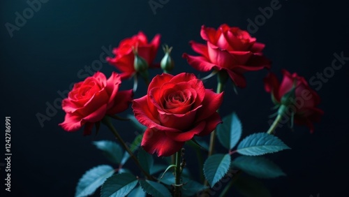 A captivating cluster of deep crimson roses, elegantly arranged against a rich, dark backdrop, showcasing the velvety texture and vibrant hue of each blossom.