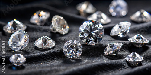 A captivating collection of various cut diamonds rests on luxurious black fabric, reflecting light beautifully. This display highlights the exquisite craftsmanship and diversity of gemstones