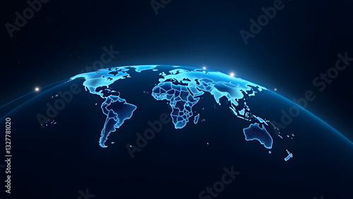 A captivating digital view of Earth from space, featuring glowing connections across continents. The dark starry background enhances the illuminated cities, symbolizing global connectivity.