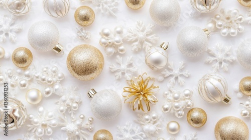 A captivating display of glittering holiday ornaments on a white background, inviting festive cheer and warmth into any space during the festive season.