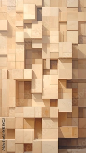 A captivating display of light and shadow on a wall constructed from numerous interlocking light beige cubes.
