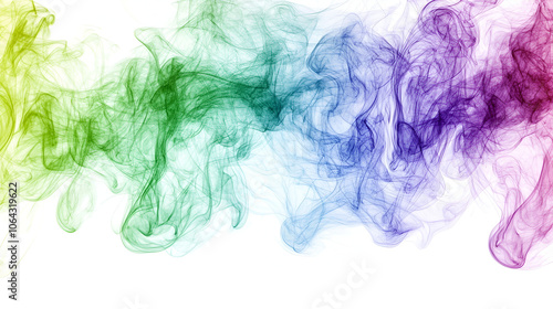 A captivating display of swirling rainbow smoke, featuring vivid hues of green, blue, and purple blending seamlessly. This abstract art evokes a sense of mystery and imagination.