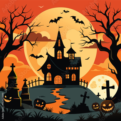 A captivating illustration of a dark, gothic mansion silhouetted against a vibrant orange and yellow full moon