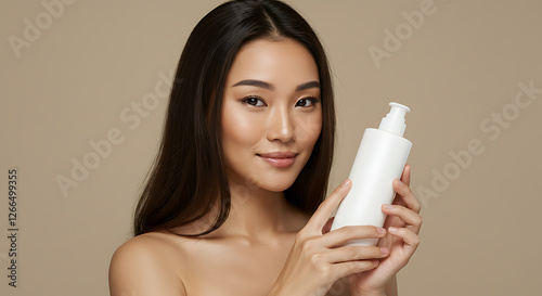 A captivating image of a beautiful Asian woman with long dark hair, showcasing flawless skin, holding a blank white bottle of skincare product.
