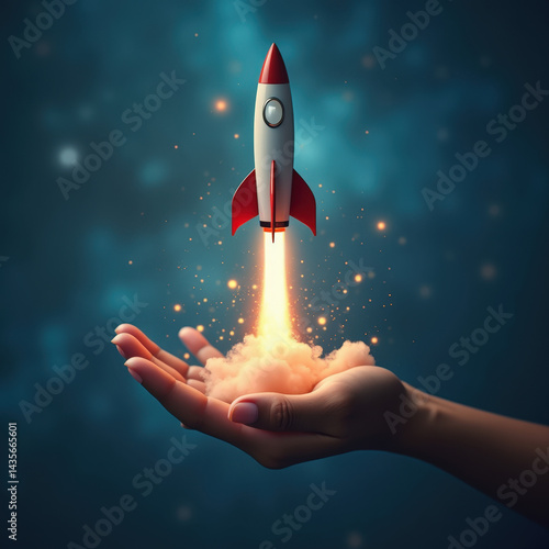 A captivating image of a space rocket launching from a European woman's hand against a blue blurry background, representing cosmic exploration and human ambition.