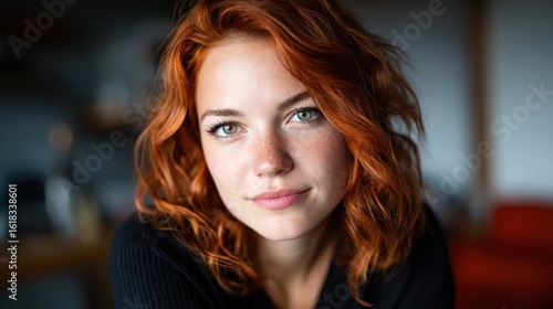 A captivating image of a young woman with curly red hair and freckles gazes sweetly at the camera, radiating warmth, charm, and inviting connection through her serene expression.