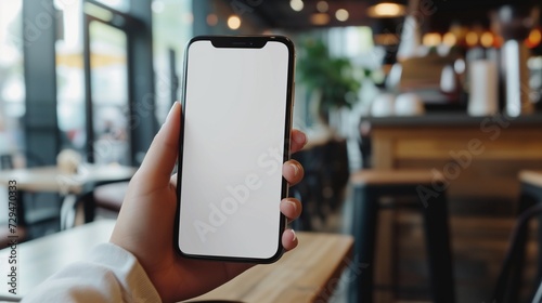 A captivating mockup scenario materializes as a woman's hand elegantly holds a mobile phone in a coffee shop