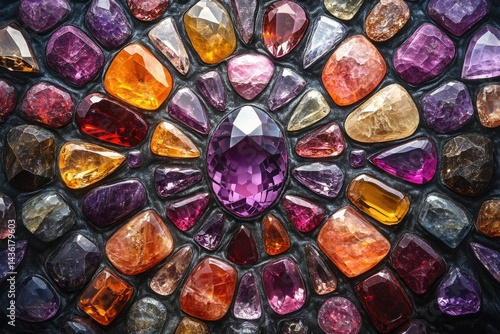 A captivating mosaic of vibrant gemstones, predominantly purple, orange, and red hues, arranged in a mesmerizing pattern.