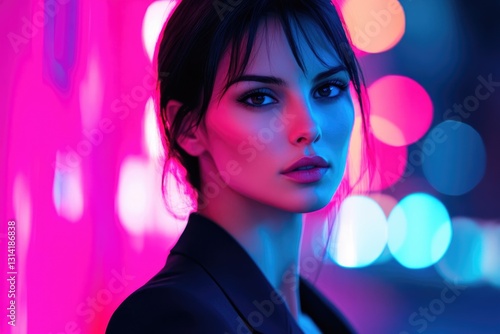A captivating portrait of a woman, illuminated by vibrant pink and blue neon lights, creating a striking cyberpunk aesthetic.