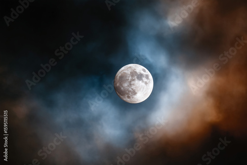 A captivating shot of the full moon shining brightly amidst dramatic clouds, casting an ethereal glow in the night sky