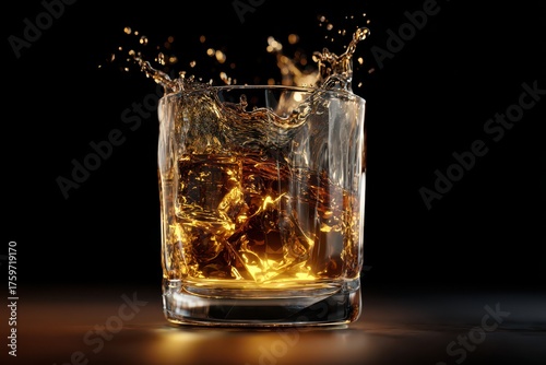 A captivating splash of golden whiskey with ice, creating a refreshing dynamic moment.
