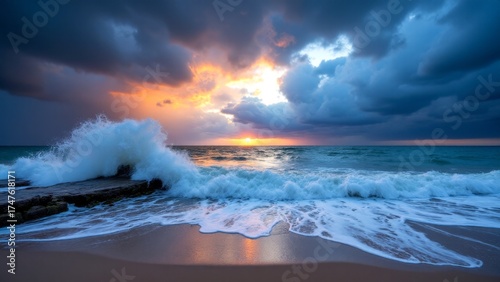 A captivating sunset over the ocean with vibrant colors and dramatic waves crashing.