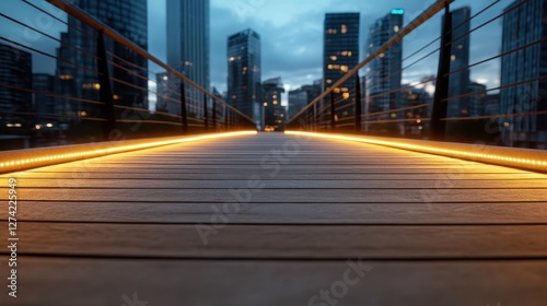 A captivating twilight view of a pedestrian bridge softly illuminated, encapsulating the serene ambiance of the city as evening draws near amidst modern architectural marvels.