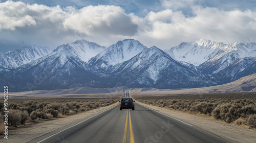 A car drives along a straight, paved road. In the background, snow-capped mountains rise up against a cloudy sky.