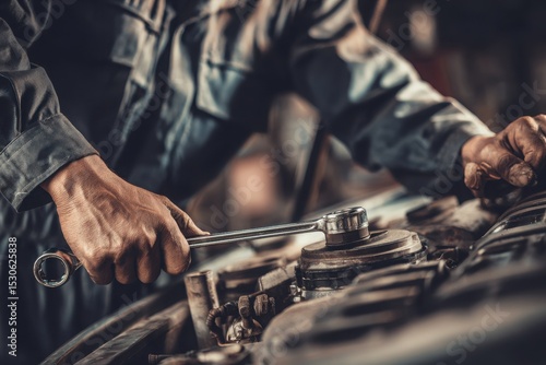A car mechanic in uniform is working with a wrench on a car engine, with a close-up view of their hands and tools in the garage for a repair service concept.