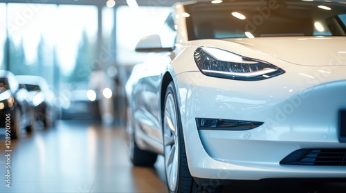A car showroom showcasing electric compact sedans. Featuring eco-conscious design and affordability