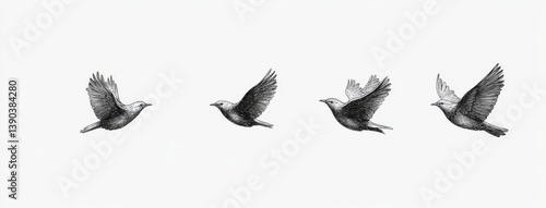 A Cardinal bird illustrated in ink. Birds drawn in black and white. Line illustrations of animals. Depictions of birds flying and sitting. Isolated on a white surface