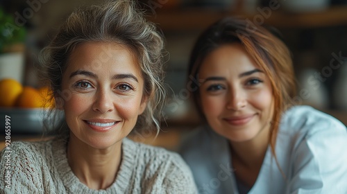 A caregiver or healthcare worker is indoors with a senior woman in the kitchen, sipping tea together.