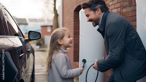 A caring father and his young daughter are engaged in plugging an EV charger into their electric car, demonstrating the importance of sustainable transportation to the new generation.