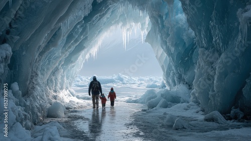A caring man and a curious child walking together through an enchanting tunnel of ice shimmering with natural light