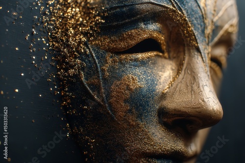 A carnival mask with a dark backdrop and gold glitter. Generative Ai