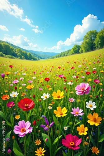 A carpet of diverse wildflowers under a clear blue sky , flowers, floral, wildflowers