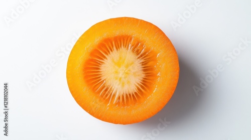 A carrot sliced lengthwise, showing its bright orange flesh and core, placed on a white background.