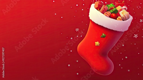 A cartoon Christmas stocking filled with treats on a red background, space for festive text.