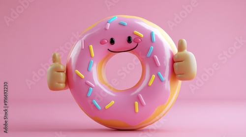 A cartoon donut with sprinkles and a smiley face is giving thumbs up